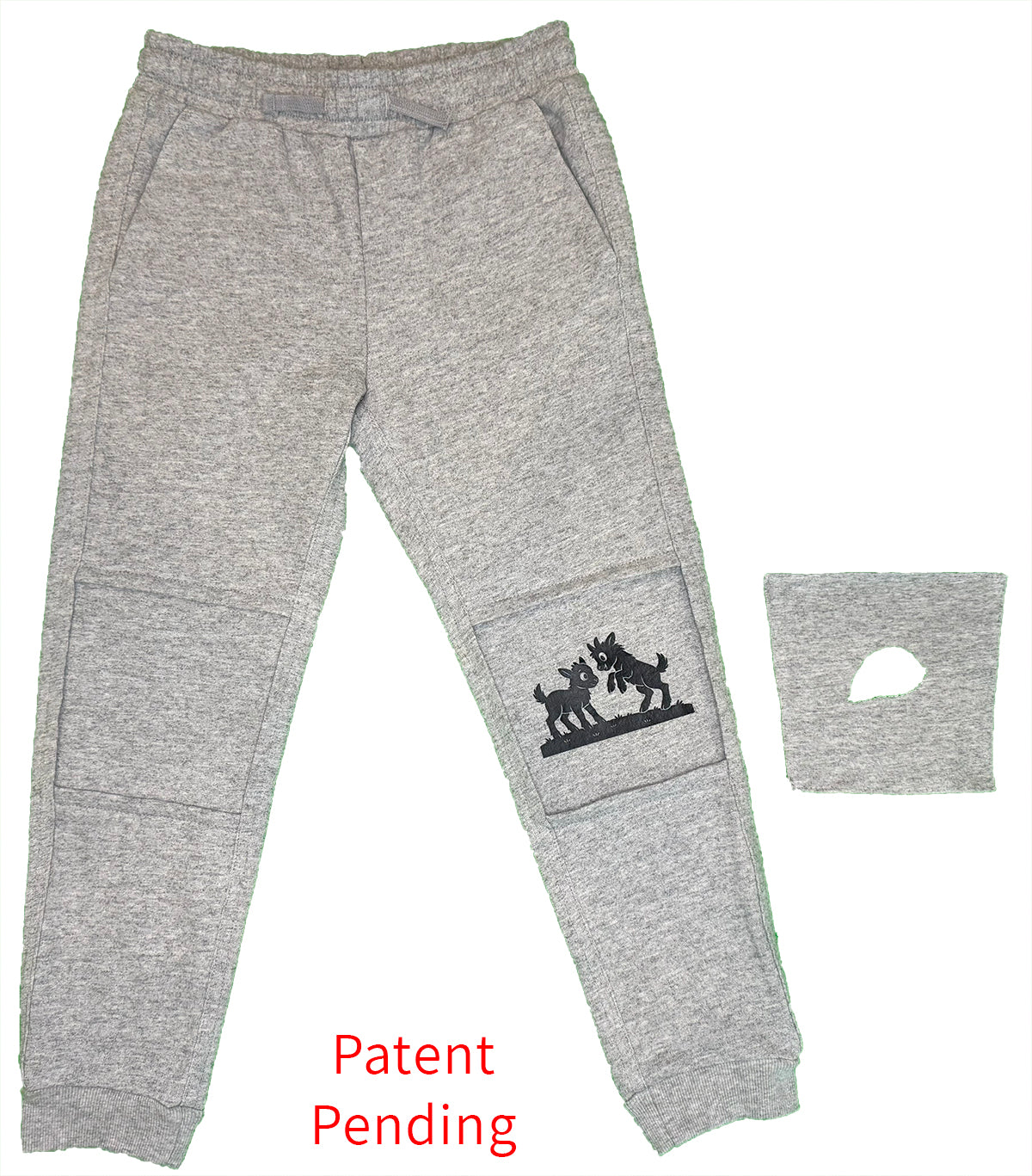 With our double-layer sweatpants, NEVER AGAIN! Our unique, patent-pending DisCover-Knee sweatpants allow you to easily and completely remove (that is, dis-cover) the damaged layer over the knee to reveal a new layer with an image of playful goat kids. Best of all, when the torn layer is removed, the pants look as if the knees were never worn. Hurray!